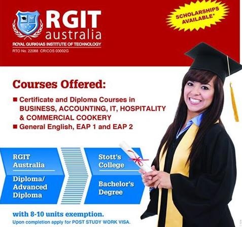 RGIT Melbourne ค่าเรียนถูกทั้ง คอร์สภาษาอังกฤษ และ คอร์สวิชาชีพ โรงเรียนตั้งอยู่ Melbourne City ย่านธุรกิจใจกลางเมืองเมลเบิร์น ซึ่งง่ายต่อการเดินทาง สามารถเดินจาก Flinder Station ไป ร.ร ได้ มีเจ้าหน้าที่คนไทยประจำอยู่ที่สถาบันฯ เพื่ออำนวยความสะดวกในการหางานพิเศษและแนะนำข้อมูลอื่นๆที่เป็นประโยชน์ เรียนภาษาผ่านเกณฑ์เร็วกว่ากำหนดที่สมัครไว้ สามารถย้ายไปเรียนหลักสูตรอื่นๆ แทนได้จบคอร์สเรียนภาษา นำคะแนนโอนเข้าสู่การเรียนมหาวิทยาลัยได้ โดยไม่ต้องสอบไอเอล มีห้องเรียนที่สะอาด มีอุปกรณ์การเรียนที่ครบครันและทันสมัย หลักสูตรภาษาอังกฤษ CERTIFICATE I EAL (English as an Additional Language: Access) CERTIFICATE II EAL CERTIFICATE III EAL CERTIFICATE IV EAL EAP 1-3 ELICOS หลักสูตร Hospitality , Accounting , Health Sciences , IT , Commercial Cookery and Business ADVANCED DIPLOMA OF HOSPITALITY DIPLOMA OF HOSPITALITY CERTIFICATE COMMERCIAL COOKERY CERTIFICATE HOSPITALITY (OPERATIONS) DIPLOMA OF ACCOUNTING CERTIFICATE IV ACCOUNTING DIPLOMA OF COMMUNITY SERVICES WORK CERTIFICATE IV IN COMMUNITY SERVICES WORK DIPLOMA OF INFORMATION TECHNOLOGY NETWORKING ADVANCED DIPLOMA OF BUSINESS DIPLOMA OF BUSINESS CERTIFICATE III IN BUSINESS
